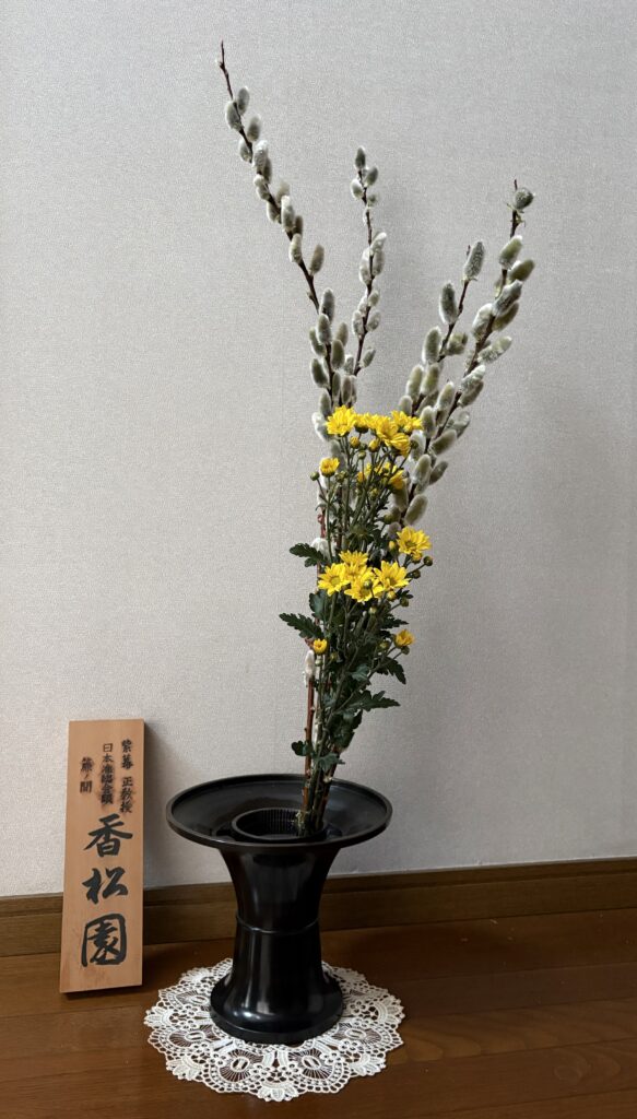 本日のお稽古はネコヤナギと小菊の二種生けのお生花です。ネコヤナギがモフモフになって、まさに猫🐱のような触り心地です。生けるのが簡単そうに見えて、ヤナギを扱っている途中でモフモフの花芽が落ちてしまうので、気を使います。
