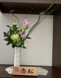 本日のお稽古は、下垂体です。小手毬、キンギョソウ、スターチスの取り合わせです。花材としてサンゴミズキも入っていたのですが、このお花には合わないため、別のお花として生けました。写真では左右の広がって見えますが、奥行きがあるだけで幅広くはないのです。
